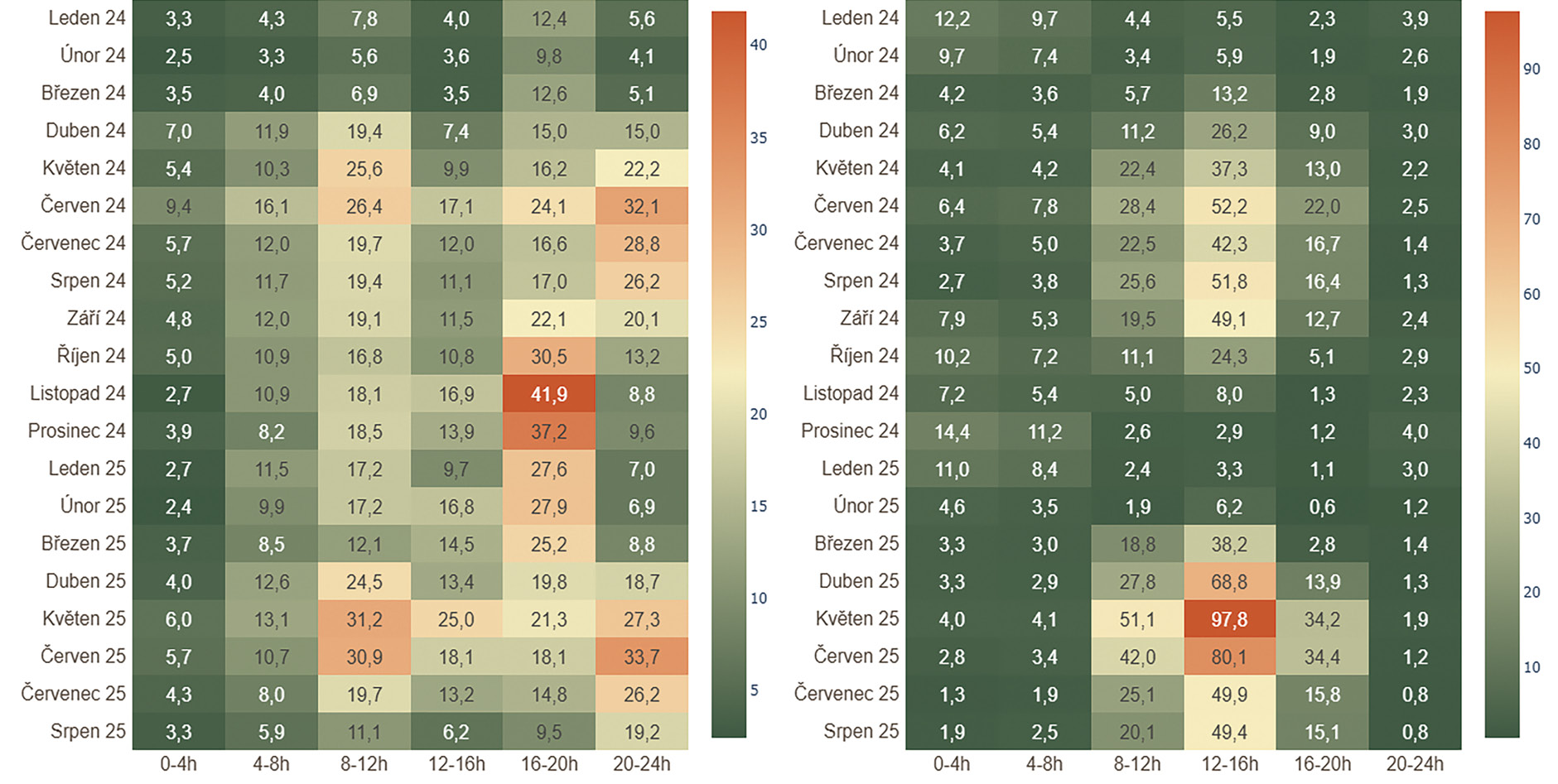 Z Obrázku č. 4 je patrné, že nejvyšší cenové hladiny aFRR+ nastávají během zimních měsíců a v ranních či večerních špičkách, zatímco nejnižší ceny aFRR− se objevují v létě v době vysoké výroby fotovoltaiky.