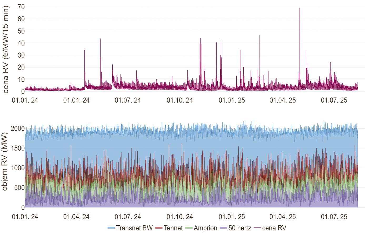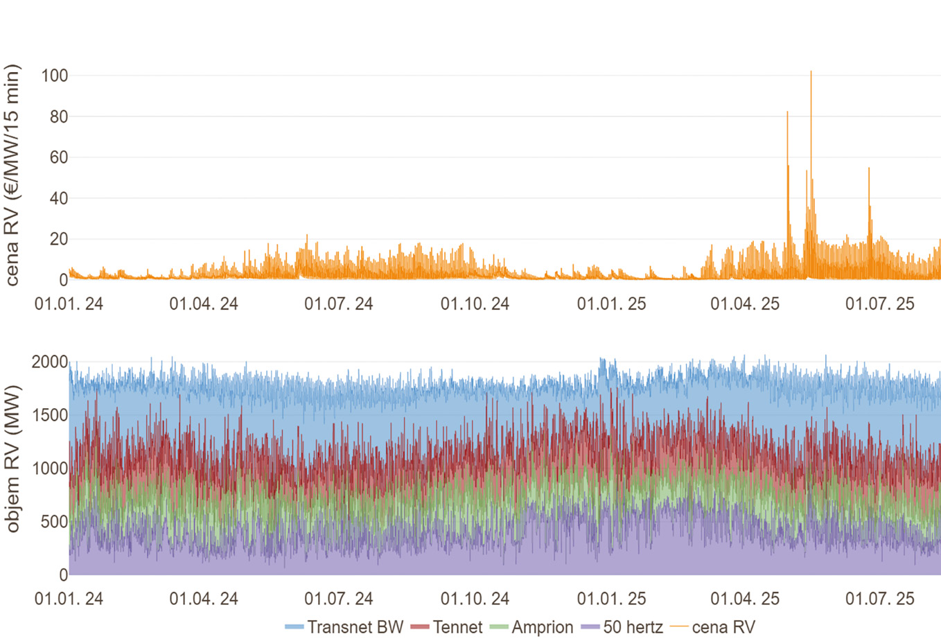 Z grafů je zřejmé, že zapojené přenosové soustavy Transnet BW, Tennet, Amprion a 50Hertz zajišťují rovnoměrné pokrytí trhu. Přesto se objevují období, kdy prudké nárůsty poptávky vedou ke skokovému zvýšení cen za rezervaci. Tento jev dokládá, že i velký a likvidní trh zůstává citlivý na nečekané změny.