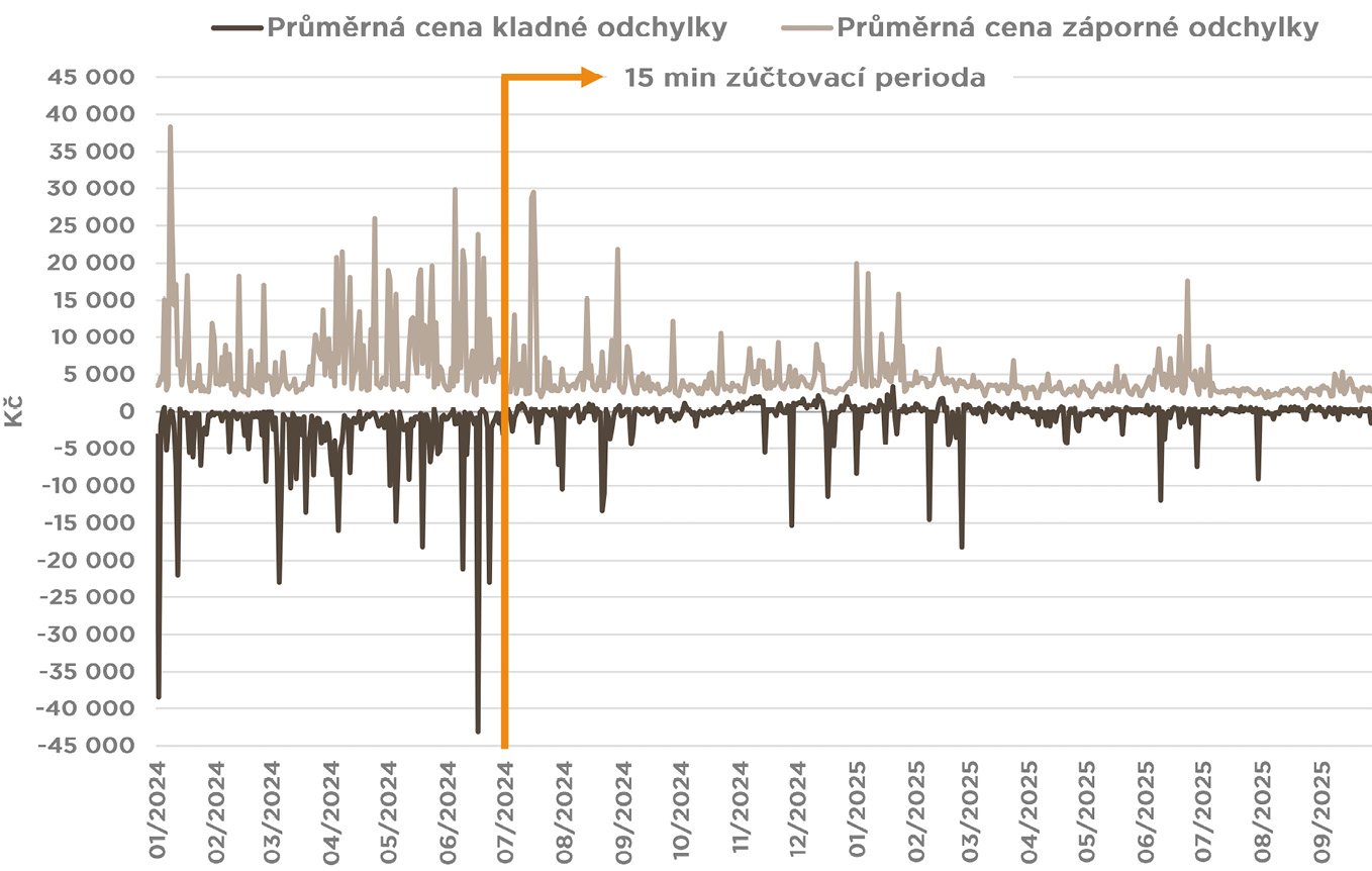 K 1. červenci 2024 došlo k zásadní změně v podobě zavedení patnáctiminutového intervalu pro zúčtování odchylek, které vyhodnocuje společnost ČEPS. Tento krok je nezbytný pro sladění obchodních intervalů s intervaly zúčtování odchylek neboli ve způsobu vyrovnávání rozdílů mezi plánovanou a skutečnou spotřebou či výrobou elektřiny jednotlivých subjektů zúčtování. Zkrácení intervalu z původní jedné hodiny na patnáct minut umožnilo přesnější a rychlejší korekce, lepší řízení soustavy a snížení rizik spojených s nerovnováhou. Nový, zkrácený interval zúčtování odchylek zároveň umožnil společnosti ČEPS splnit legislativní požadavky a přispěl ke zlepšení řízení odchylek v elektrizační soustavě díky očekávanému snížení systémových odchylek a lepší reakci subjektů zúčtování na cenové signály (Obrázek č. 1).