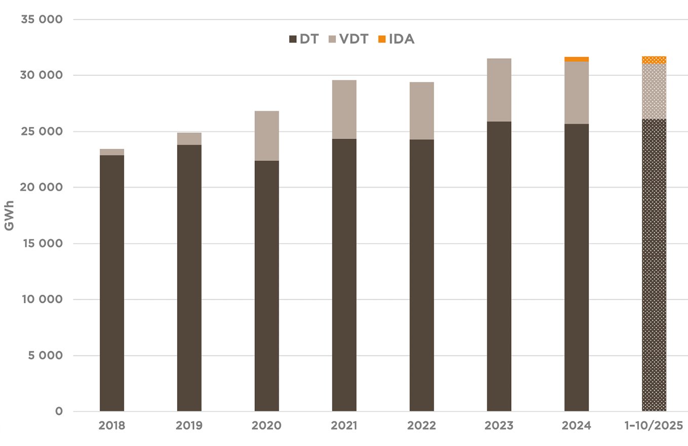 Zájem o produkty OTE na krátkodobém trhu s elektřinou stoupá. Operátor trhu již druhým rokem za sebou dosahuje výborných, v porovnání s předchozími lety rekordních výsledků. Za deset měsíců roku 2025 se na krátkodobých trzích s elektřinou organizovaných OTE již zobchodovalo větší množství elektřiny než za celý rok 2024 (Obrázek č. 1).