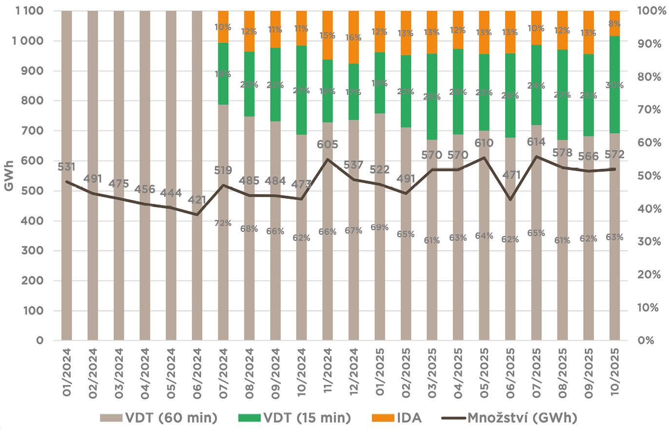 Svou roli v rekordním růstu mělo zavedení nových obchodních produktů. Vnitrodenní aukce a zkrácení zúčtovací obchodní periody z hodiny na čtvrthodinu při vnitrodenním obchodování zavedl OTE na český trh s elektřinou již začátkem loňského léta, spolu s čtvrthodinovou zúčtovací periodou odchylek. Od té doby mohou obchodníci nakupovat elektřinu jak po hodinách, tak po čtvrthodinách. A o nové schéma je opravdu zájem. Po více než roce tvořily čtvrthodinové produkty na VDT 25 % zobchodovaného množství elektřiny, v říjnu to bylo již celých 30 % (Obrázek č. 3).
