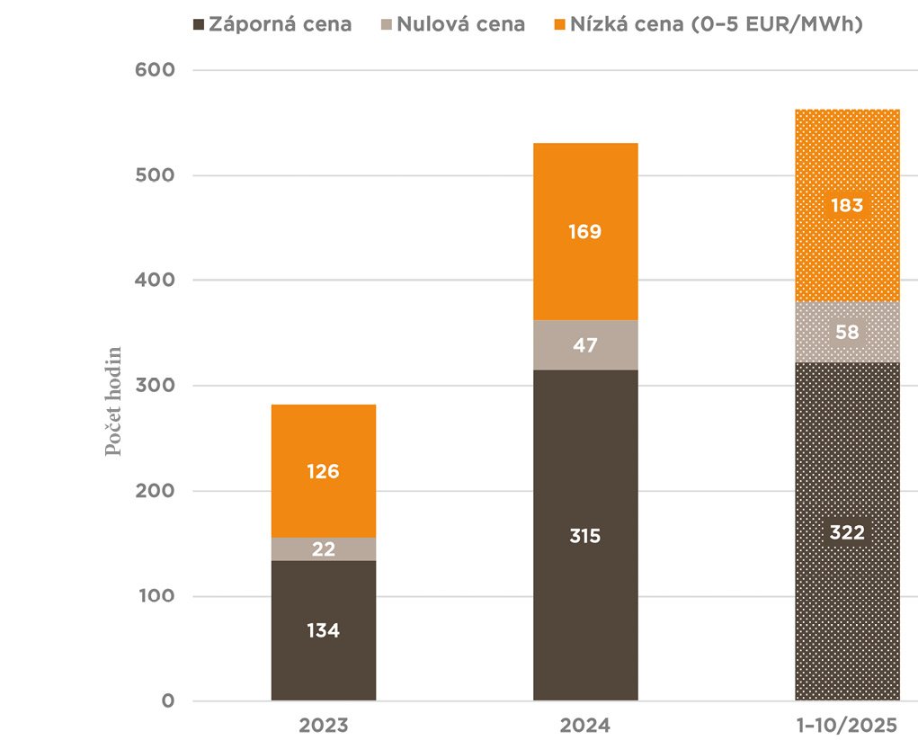 A těchto situací v Česku každý rok přibývá. Rekordní bude i ten letošní. V prvních deseti měsících roku 2025 zaznamenal denní trh společnosti OTE celkem 563 hodin s nízkými nebo zápornými cenami elektřiny, z toho 322 hodin v záporných hodnotách, 58 s cenou nulovou a 183 v rozmezí 0 až 5 EUR/MWh (Obrázek č. 4). Oproti celému roku 2024 jde o nárůst o 32 hodin.