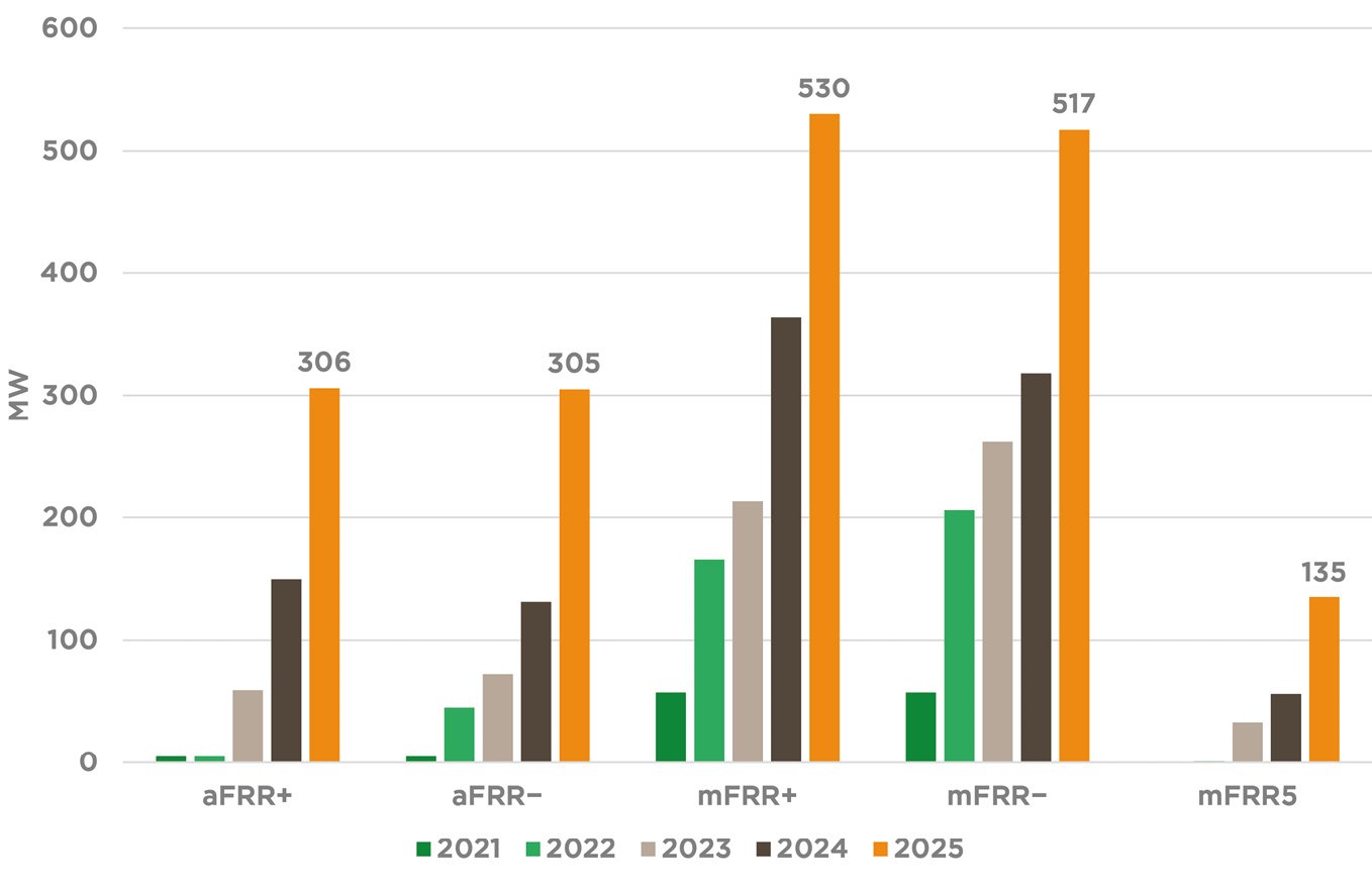 Lví podíl na tomto růstu mají právě agregátoři. Pro potřeby sekundární regulace (aFRR) disponují přes 300 MW certifikovaného výkonu v obou směrech, pro terciární regulaci – kladnou i zápornou – ovládají dokonce více než 500 MW (Obrázek č. 1). V případě mFRR začal raketový růst certifikací už v roce 2022, u aFRR především v posledních dvou letech.