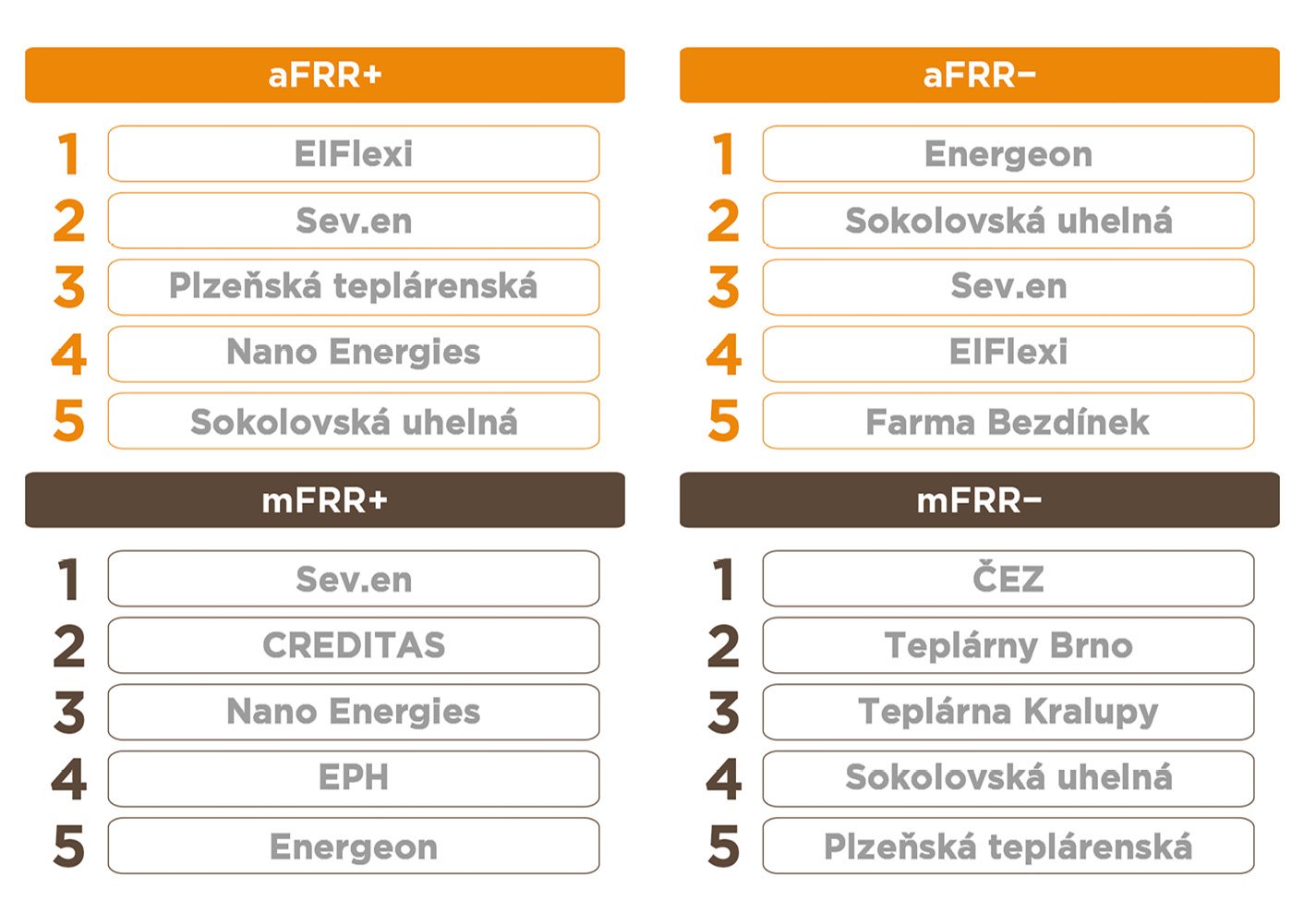 V záporné regulaci zatím tradiční poskytovatelé přední příčky tendrů nevyklidili. Službu aFRR− historicky ovládá Sev.en, ač od loňska jeho role v dlouhodobých nákupech klesá a nejvýznamnějším aktérem se stala společnost Energeon, která provozuje řadu plynových kogeneračních jednotek a horkovodních elektrodových kotlů v Chrudimi. Nejúspěšnějším agregátorem byla v tendru na letošní první půlrok společnost EIFlexi, která dosáhla na 12% podíl na rezervacích. Za zmínku stojí páté místo Farmy Bezdínek, která zápornou regulaci poskytuje pomocí třímegawattových elektrokotlů. Vyrábí si díky tomu velmi ekonomicky efektivně část tepla potřebného pro své skleníky, z nichž sklízí na 6 000 tun rajčat ročně.