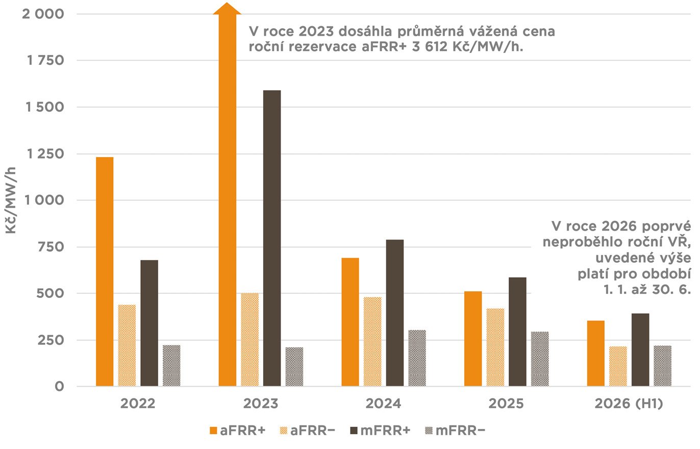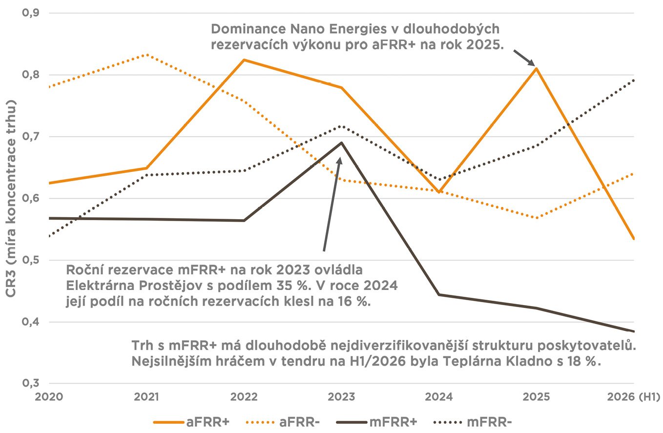 Roční rezervace pro mFRR− jsou pak tradiční doménou společnosti ČEZ (stejně jako český unikát, služba mFRR5). Druhé housle hrají v této službě Teplárny Brno, třetí největší podíl na rezervacích pro H1/2026 připadl teplárně v Kralupech. Agregátoři se v dlouhodobých rezervacích pro mFRR− dosud neprosadili.
