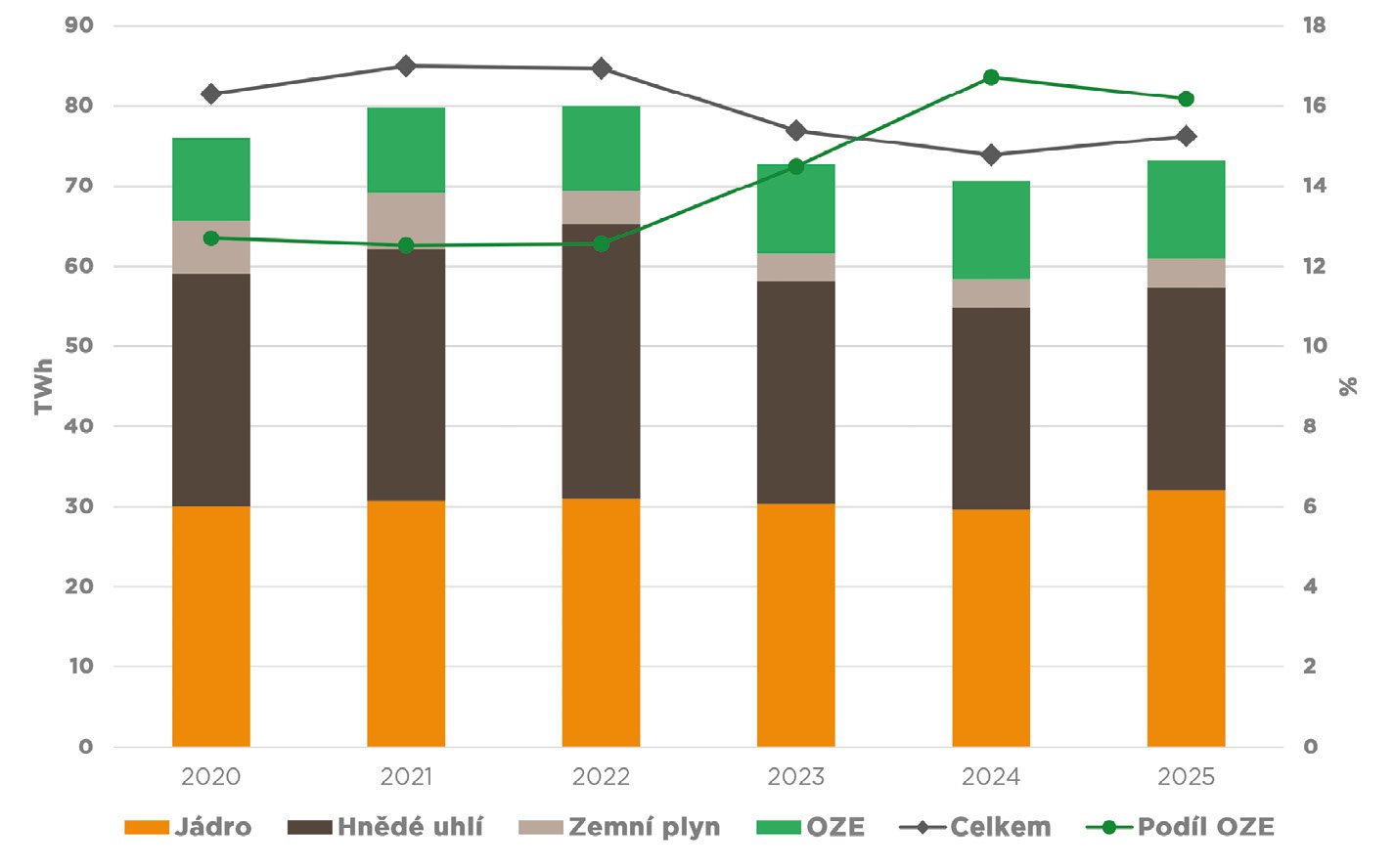 Obrázek č. 1: Výroba elektřiny v ČR dle zdrojů v letech 2020–2025