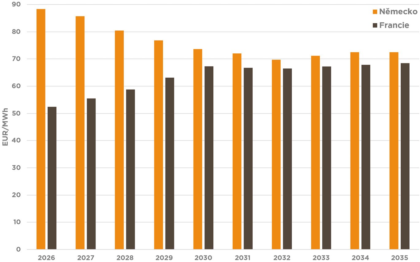 V této fázi je stále velmi obtížné posoudit a kvantifikovat skutečný dopad nového opatření do nákladů na elektřinu a konkurenceschopnosti dotčených odvětví. Bude totiž silně záviset na cenách dodávek elektřiny, a tedy i budoucích cenách produktů na velkoobchodních trzích, jak je znázorněno níže na srovnání mezi Francií a Německem. Pozoruhodná je mimochodem velmi vysoká konkurenceschopnost současných cen futures kontraktů na francouzském trhu, s rozdílem až 35 EUR/MWh oproti Německu pro rok 2026, stejně jako specifikum Francie spojené s fenoménem Contango (tj. vyšších cen za dodávky v daleké budoucnosti než za dodávky v blízkých letech, což je přesný opak situace v sousedních zemích).