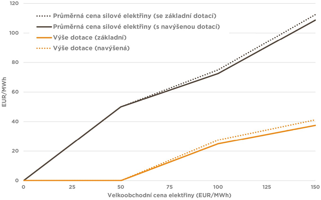 Pokud dále vezmeme v úvahu skutečnost, že 50 % obdržené dotace musí být reinvestováno do dekarbonizace, elektrifikace nebo flexibility, výše dotace se efektivně ještě sníží. A to v principu o polovinu, což znamená, že přímá podpora ceny elektřiny by ve výše uvedeném příkladu činila 10 EUR/MWh a cena dotované silové elektřiny po započtení subvence dosáhla 70 EUR/MWh, nikoli 50 EUR/MWh.