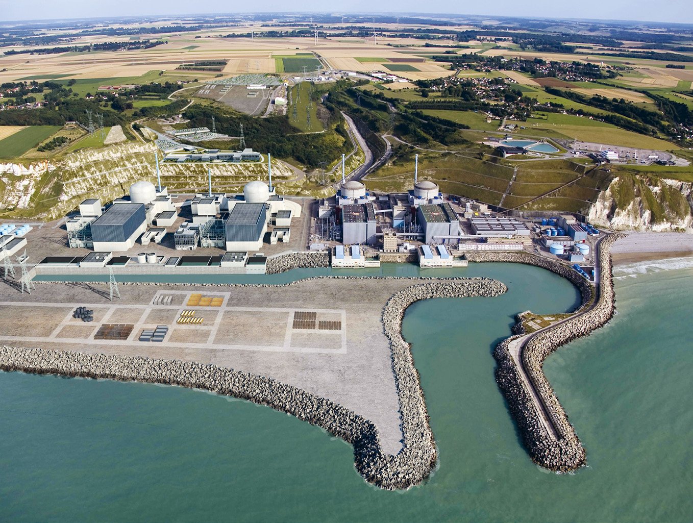 Dnes v Penly stojí dva reaktory PWR spuštěné v roce 1990 (na fotce vpravo), dvojice nových reaktorů EPR2 (vlevo) má být spuštěna za 12 let