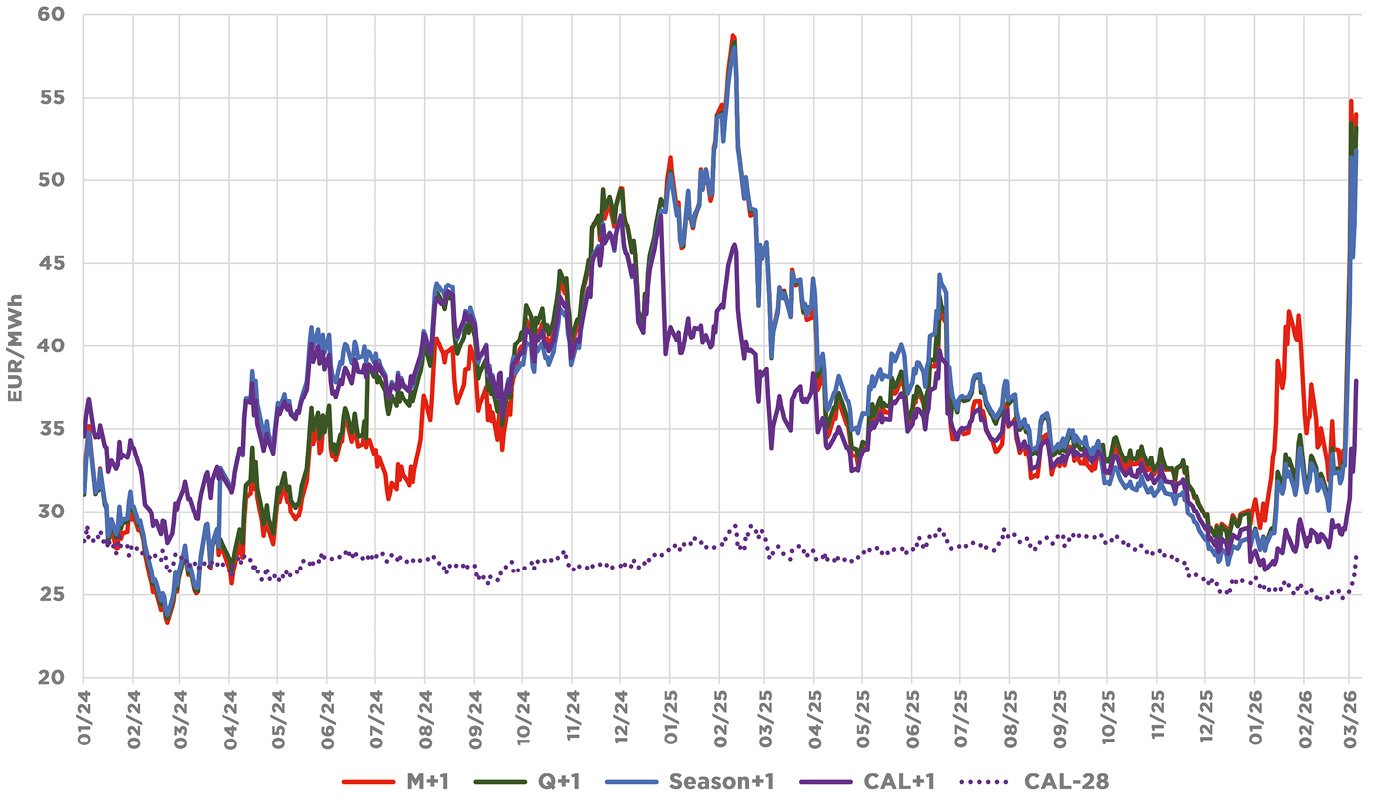 Týdny gradujícího napětí okolo situace na Blízkém východě vyústily 28. února v americko-izraelský útok na Írán. To způsobilo prudký nárůst cen nejen ropy, ale i plynu a elektřiny. Referenční nizozemský front-month kontrakt na TTF dosáhl během 3. března téměř 66 EUR/MWh, nejvyšší hodnoty za tři roky. Zavírací cena byla nicméně nižší, a to 53,6 EUR/MWh. Hlavním katalyzátorem tohoto vývoje je ochromení produkce LNG v Kataru po íránském útoku dronů na zařízení v Ras Laffanu a nevyhlášená, ale faktická blokáda Hormuzského průlivu, kterým prochází pětina světových dodávek LNG. Tankery jsou ostřelovány a pojišťovny přestaly pokrývat válečná rizika.