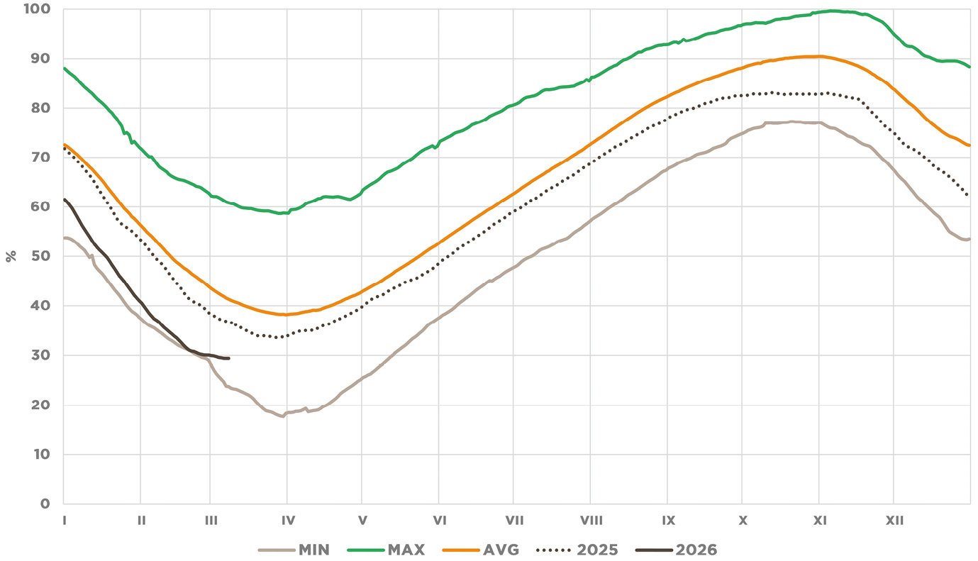 Důležitým faktorem pro vývoj cen zůstávala naplněnost evropských zásobníků, která v druhém lednovém týdnu klesla pod 55 % (o 12 p. b. níže než v předcházejícím roce). Německé zásoby se propadly dokonce pod 47 %. Situaci navíc začaly komplikovat technické problémy v regionu, mimo jiné odstavení francouzské jaderné elektrárny Flamanville a omezení dovozu LNG do Francie v důsledku bouří, což v kombinaci s rychlým čerpáním ze zásobníků vedlo k růstu cen. Geopolitické napětí v Íránu také zvyšovalo rizikovou prémii kvůli možnému přerušení dodávek zkapalněného zemního plynu přes Hormuzský průliv v případě intervence Spojených států. Další geopolitické riziko představovaly pokračující ruské útoky na ukrajinskou plynárenskou infrastrukturu. Nízké zásoby tak v kombinaci s politickou nejistotou udržovaly trh v napětí a ceny referenčního únorového kontraktu oscilovaly mezi 27 a 32 EUR/MWh.