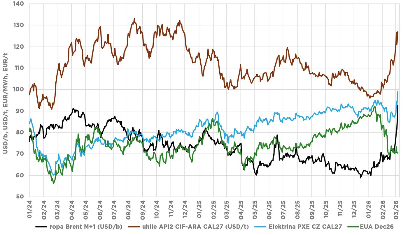 Evropa navíc na konci února zažívala výrazné oteplení, přičemž průměrné teploty stoupaly až o 5 °C nad sezónní normu. To v kombinaci s očekávanou silnou produkcí fotovoltaiky vytvářelo tlak na snižování cen elektřiny, který však do jisté míry kompenzovaly vysoké ceny uhlí: API 2 front-month dosáhl v únoru třináctiměsíčního maxima. Relevanci ceny uhlí navíc dále posílila nervozita kolem Íránu, jelikož v případě omezených dodávek plynu by se Evropa mohla částečně uchýlit k posílení výroby elektřiny v uhelných elektrárnách. Povolenky se navíc vrátily k úrovni 74 EUR/t.