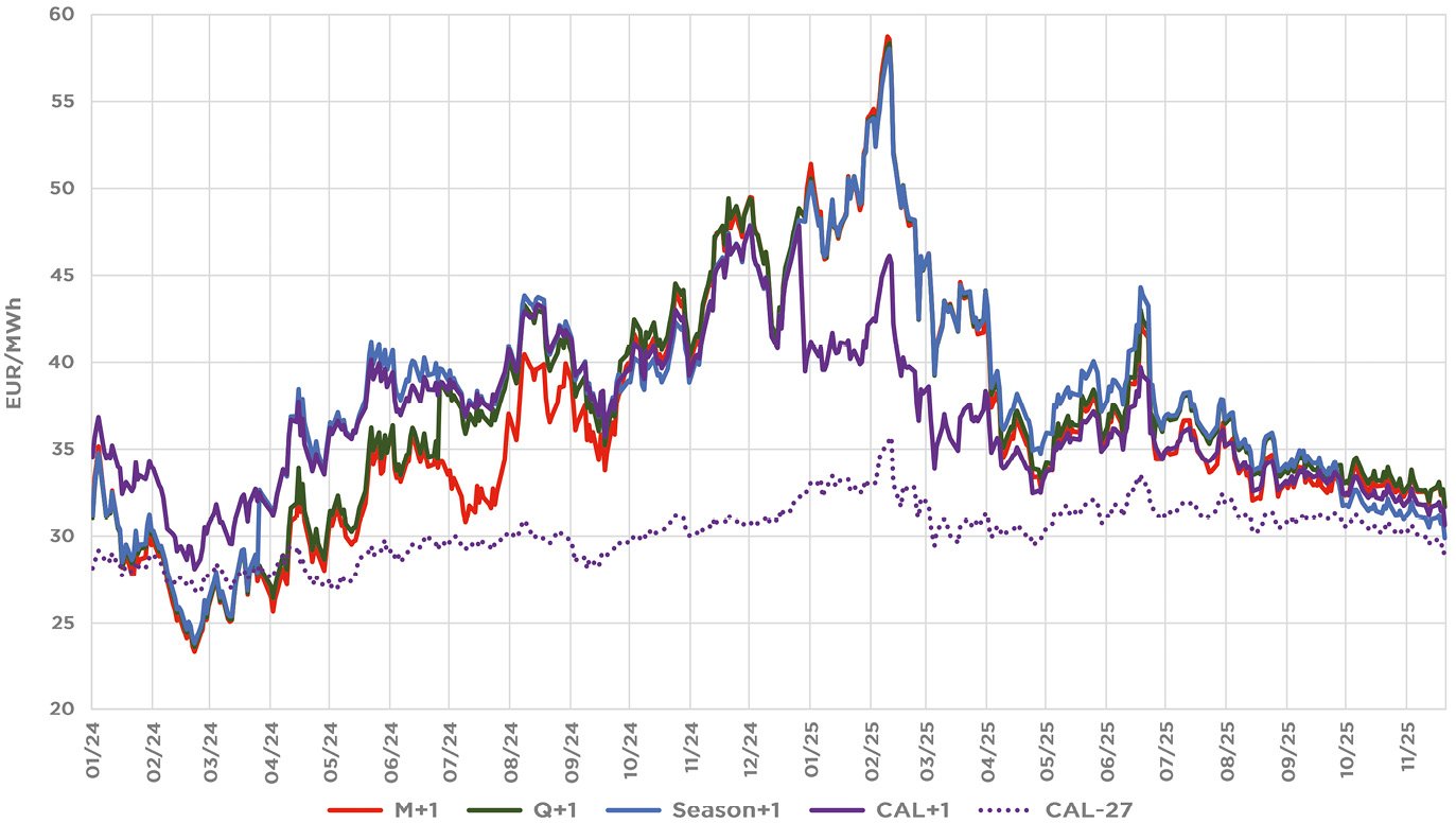 Despite intensified EU efforts to end Russian energy imports and ongoing strikes on energy infrastructure, European energy prices remained stable in the last quarter. Mild-winter forecasts, high gas storage levels and steady LNG inflows kept markets calm, with prices easing further in late November.