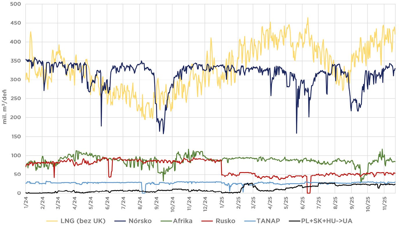 Nateraz však strednodobé predpovede indikujú teplý december a začiatok januára, čo v čase písania tohto článku stlačilo ceny plynu prudko nadol. Holandský budúcoročný plyn TTF Cal 26 klesol 21. novembra 2025 dokonca na svoje viac ako 18-mesačné minimum: 29,1 EUR/MWh. Na pozadí tohto poklesu je dostatočná naplnenosť zásobníkov, ktorá bola pre celú Európu (bez Spojeného kráľovstva) k 21. novembru na úrovni 79,6 %. Hlavným dôvodom poklesu a to dokonca napriek studenej vlne, ktorá aktuálne zaplavila Európu, sú stabilne vysoké dodávky LNG. Európa profituje z nízkeho ázijského dopytu a nárastu americkej produkcie vďaka otváraniu nových skvapalňovacích liniek. Podľa US Energy Information Administration má celková severoamerická ročná kapacita, zahŕňajúca USA, Kanadu a Mexiko, do roku 2029 vzrásť asi o 180 miliárd m3 oproti stavu zo začiatku roku 2024. Ceny plynu by tak v budúcich rokoch mali mať tendenciu skôr klesať.